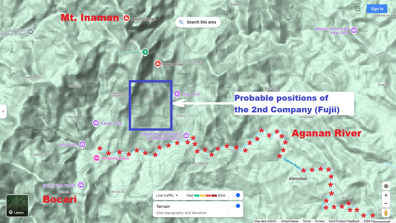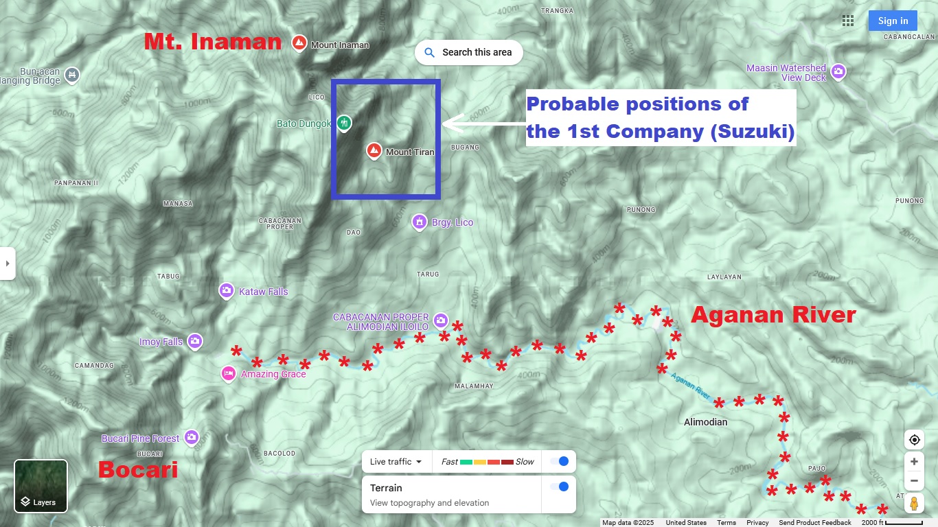 The village of Bocari is at the foot of the outer rim of a depression around Mt. Inaman that peaked at about 1,350 meters. The outer rim of the basin measured about four kilometers east to west and two to three kilometers from north to south. On both sides of the 10-meter wide river, there were some 600 houses of villagers around terraced and skillfully irrigated rice fields.More Japanese soldiers trickle into Bucari.