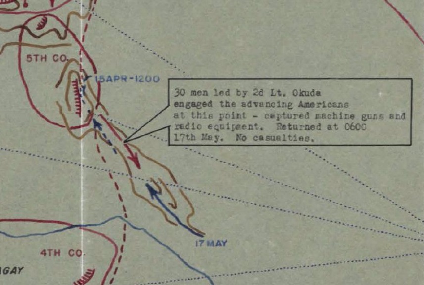30 men led by 2d Lt. Okuda engaged the advancing Americans at this point - captured machine guns and radio equipment.