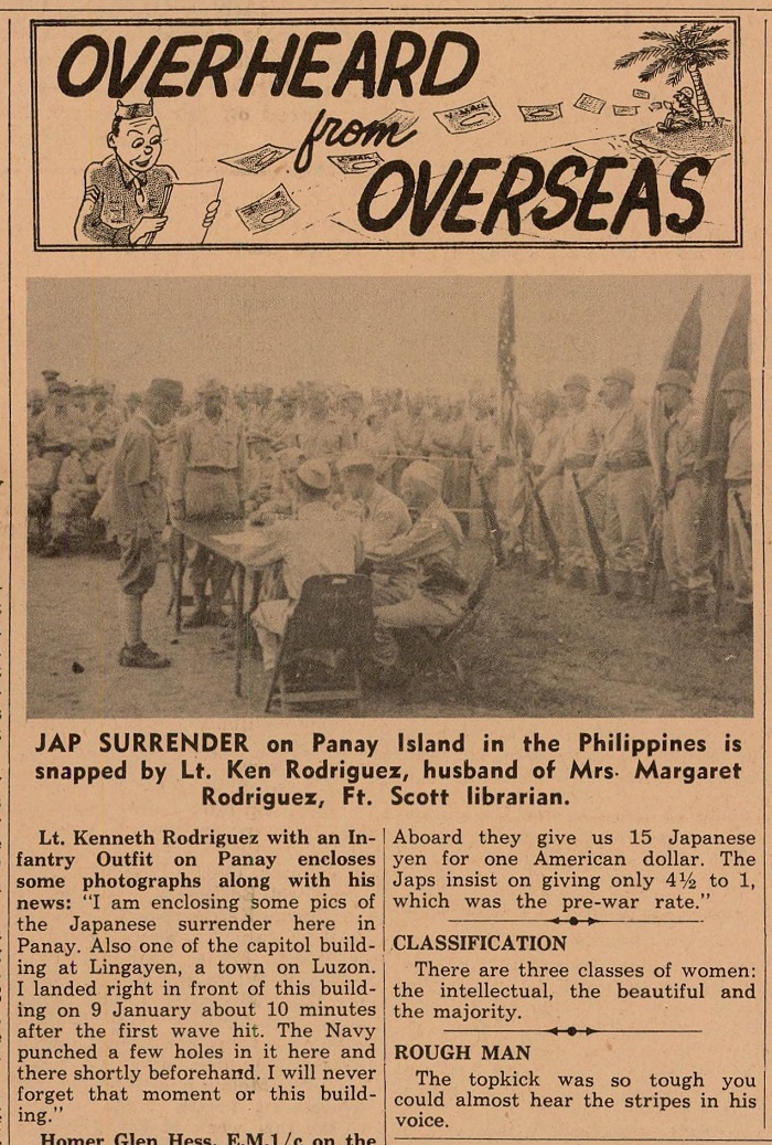 JAP SURRENDER on Panay Island in the Philippines is snapped by Lt. Ken Rodriguez, husband of Mrs. Margaret Rodriguez, Ft. Scott librarian.