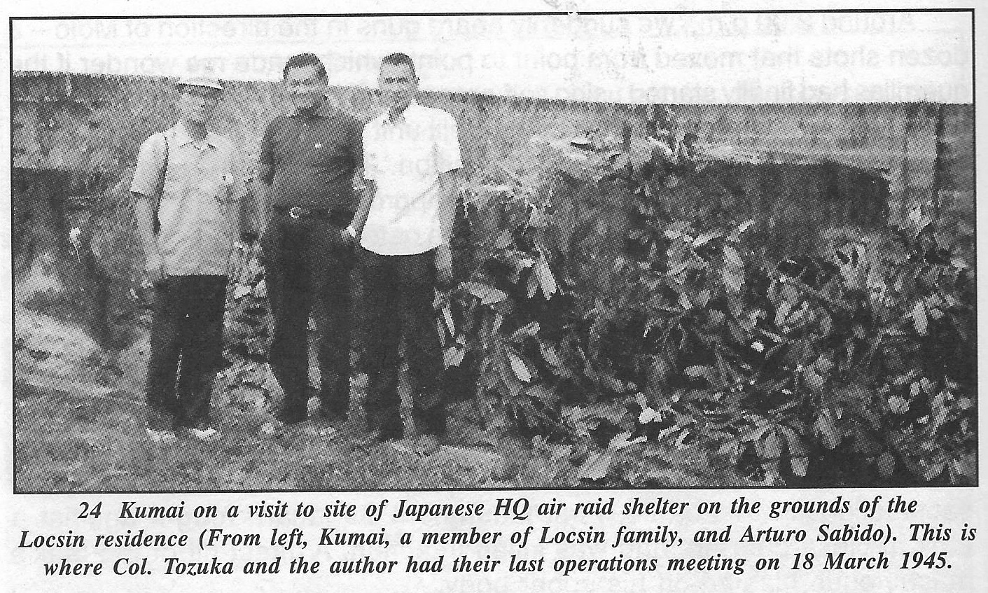 At the meeting, the headquarters staff all looked tense. Apart from Lieutenant Colonel Ryoichi Tozuka (unit commander). 1st Lieutenant Ishikawa, and myself, there were the following: Army Doctor Egami, Finance Officer 1st Lieutenant Kuge, 1st Lieutenant Yamamoto (deputy commander of the machine-gun force), Lieutenant Fujii of the 2nd Company, Captain Kaneyuki Koike (Kempeitai commander), and Lieutenant Noda of the 1st Company of the Tanabe unit, Commander Suzuki of the Transport Company, and 1st Lieutenant Mizutani (commander of the oil tank construction unit), a captain in charge of engineering of the airfield construction unit, Commander Ika of the Hôjin Company, 1st Lieutenant Nakamura of the remaining 102nd Division forces, President Kimura of the Japanese Association (Nihonjin-kai), and Medical Doctor Tanaka of the Iloilo Army Hospital. With a few dozen men, Captain Torao Saitô (machine gun unit commander) had left the previous night to lead the retreat of the Santo Rosario garrison at Guimaras. They managed to get back later that evening.