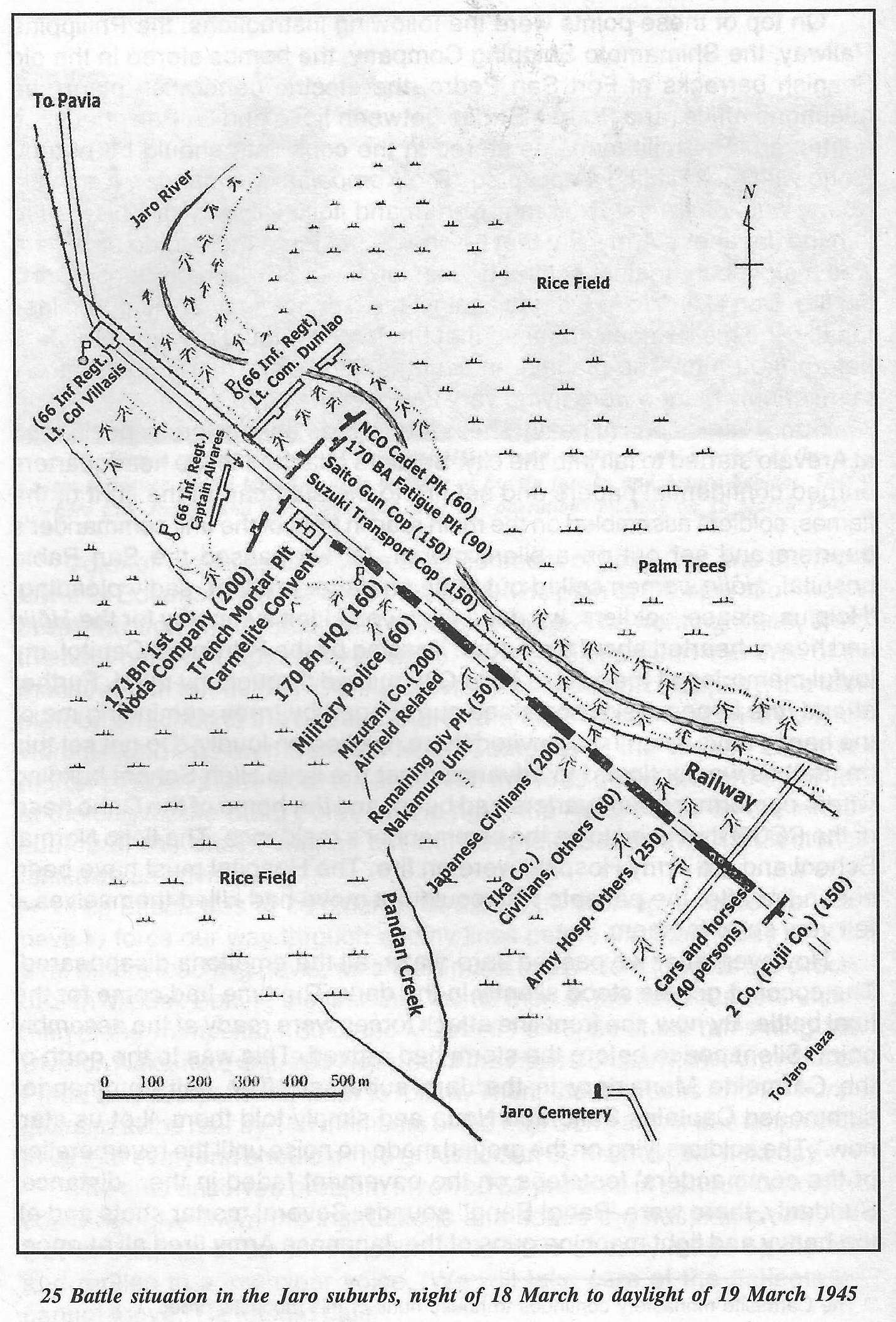 At around 4 a.m. of March 19*, Lieutenant Fujii, commander of the 2nd Company that was posted as rear guard, surprised the headquarters staff by showing up suddenly. He said: ‘Shall the 2nd Company cross the Jaro River on the right and attack from that side? The rear would be empty without their protection, exposing the Hôjin Company, hospital patients, and Hôjin women and children left behind. Otherwise, however, we would all be destroyed.’ Colonel Tozuka then ordered, ‘All right, Fujii. Do that.’