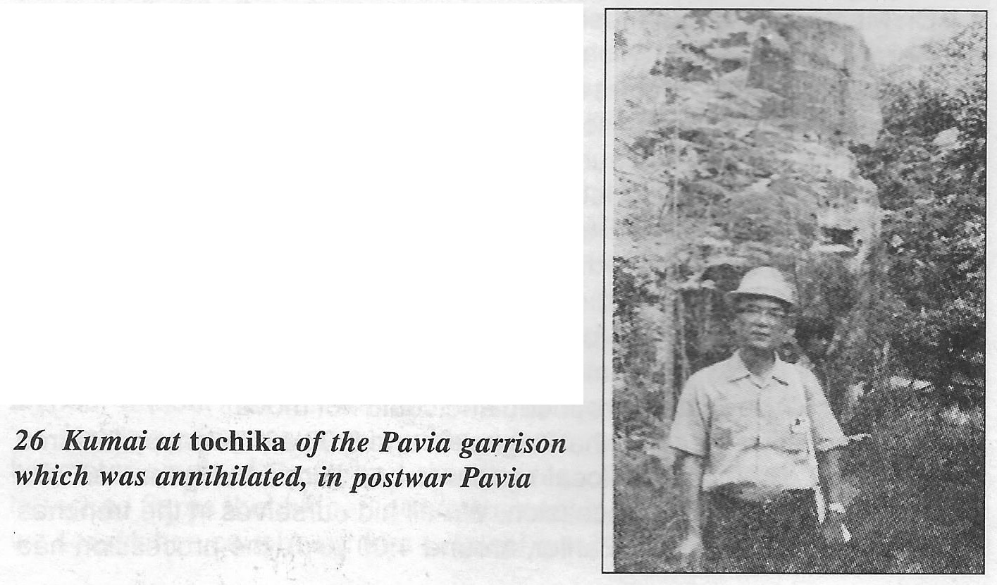 THE JAPANESE ARE ORDERED TO TRY AGAIN By dusk of March 19,* we ordered the front left forces of Noda to attack in the direction of the vast plain to Pavia. But before the command to attack could be made, there was a mighty guerrilla shooting spree that led to the bad news that company commander Noda, Master Sergeant Sô and other main officers of the company were killed in combat. Although Lieutenant Noda had dashed towards enemy positions, his subordinates were terrified by the fierce shooting and did not join him. Noda was shot to death as he was trapped in the enemy’s wire-fence. Master Sergeant Sô got seriously wounded and killed himself with his pistol.