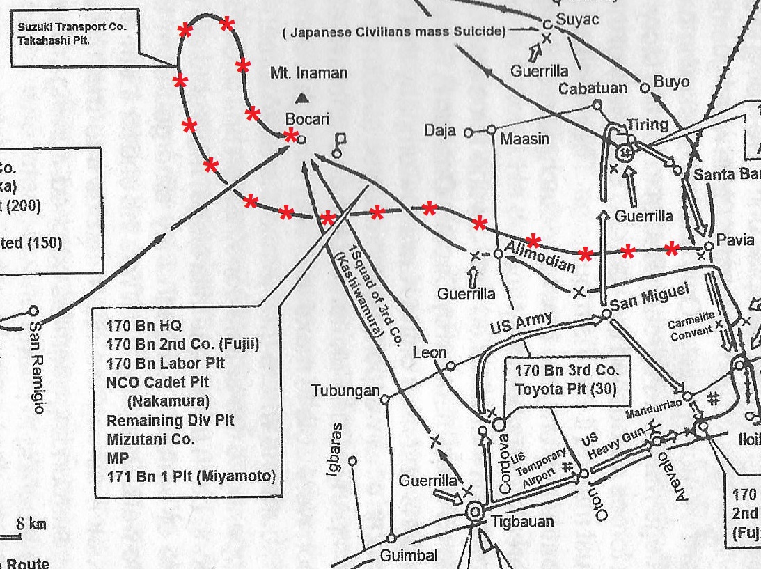 The attack was to commence at 8 p.m. that night, since we would have to force our way through enemy lines before the moon rose at 10 p.m. Before reaching Pavia, we should make a quick turn towards the direction of San Miguel. Behind the first line, the 60 men of the headquarters unit, 60 men of the Kempeitai, 180 of the Mizutani Force, 50 of the remaining 102nd Division Nakamura unit, 200 Hôjin, 80 of the Hôjin Company, the Army Hospital Force and 300 patients, were to follow. Then, the 20 trucks and 20 horses, guarded at the rear by 150 members of the Fujii Company. It was emphasized to all that everyone should arrive at Alimodian by dawn of the next day.