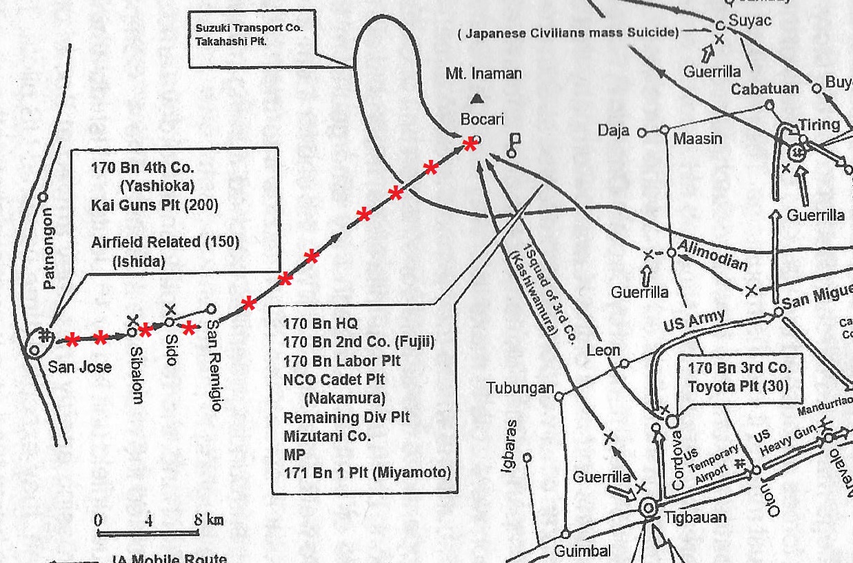 Section 8.3 At the village of Cagay on the 22nd, we were fortunately able to make the prearranged contact with the Yoshioka Force from San Jose, Antique. We had sent them a radio message to abandon San Jose and move to Bocari.The second version had the Antique force abandoning San Jose on March 31, 1945.