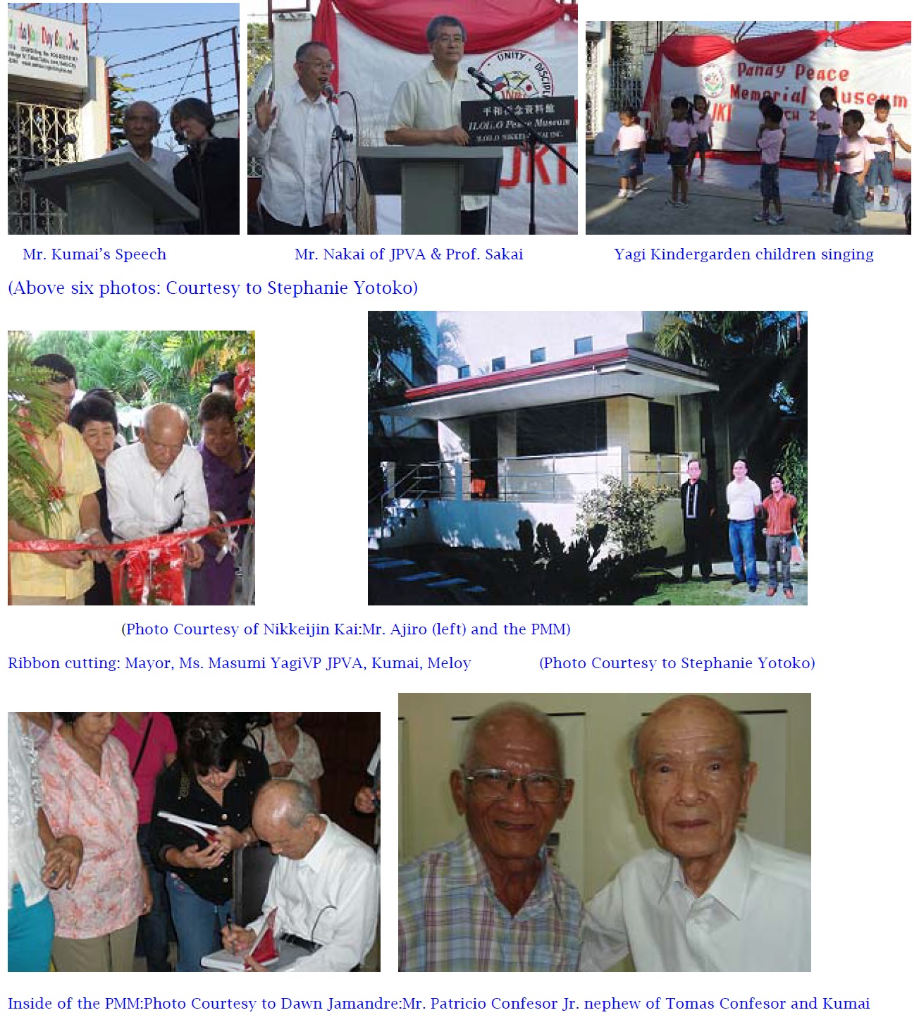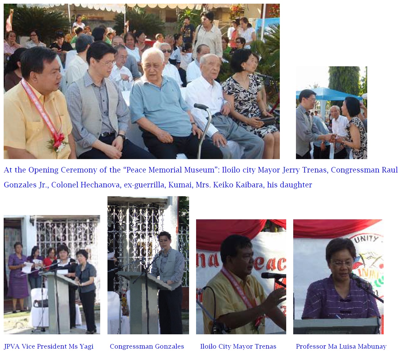 In 2003, I came across Mr. Kumai’s book at the library of Yasukuni Shrine, whose collection is the best regarding the Pacific War. I was impressed with its value as a record, and the responsible stance of the author as a survivor. Writing to him, with my sample translation, I was given permission to translate. Through Mr. Kumai’s introduction, Professor Ma Luisa (Meloy) Mabunay of UP Visayas, who is the expert on the Panay hojin, graciously agreed to edit, and she invited Professor Ricardo (Rico) T. Jose of UP Dilman to give notes to the incidents, from his profound knowledge of the Philippines under the Japanese occupation. With the support of Mr. Ajiro, and the notes completed up to Chapter III, 500 copies were printed for distribution at this occasion. The author and translator express our heartfelt appreciation to the gifted Professors Mabunay and Jose for their sincere work, amid a lot of responsibilities they have. We thank from the bottom of our heart for the understanding and kind assistance given by Mr Masataka Ajiro. The formal publication is expected on the completion of the notes by respected Professor Jose.