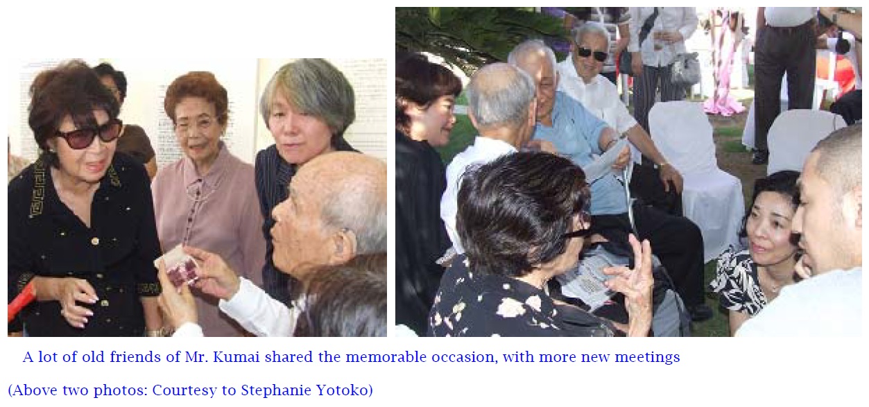 From left: Chizuko, Stephanie, a volunteer for Nikkeijin-kai, Geordinie, guard of the Amigo Hotel, whose grandfather was a guerrilla in Capiz, so he had Mr. Kumai sign in his book, me, and Dawn. Ms Mila O. Yotoko, on the extreme right, is another volunteer for Nikkeijin-kai, and proud mother of capable and lovely Stephanie. Mila’s sister Jessie is Principal of the kindergarten of the Nikkeijin-kaikan. With her brother Mr Eric Yotoko, all the family, besides pursuing their own businesses, cooperated with the dedicated staff of the Nikkeijin-kai, made a great effort, and led all the visits and ceremonies to a great success, including the fantastic home made dishes at the memorial dinner. Caring for and reaching out to Mr. Kumai, protecting him from the sun with an umbrella: had it not been for the devoted assistance of the three, and Filipino friends at Nikkeijinkai, we could never have been able to have such wonderful times. Last but not least, I with all the Japanese attendants, give our big and heartfelt “Thank you” to them.