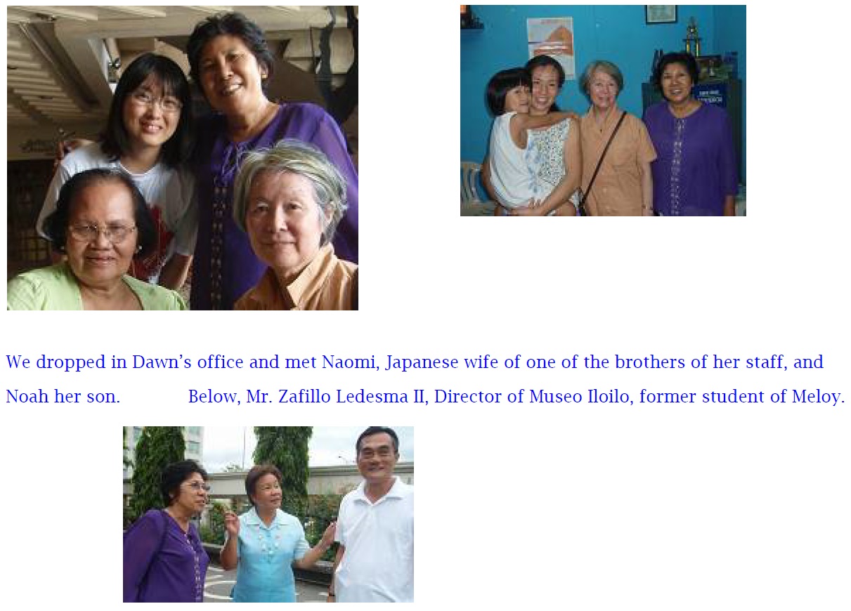 Prof. Meloy is a smart, warm-hearted lady, and is full of humor. In her busy schedule of teaching and administration duties, she found time for editing, and during the last few weeks of the project, she organized a list-serve connecting three points: herself, Prof. Rico at Manila, and Mr. Kumai/me in Tokyo, through which we, the two professors took trouble of proof reading, involving us. Then Professor Meloy visited the printer more than once to see the work done. She also contacted all the people in Kumai’s guest list, who he wanted to invite to the ceremonies and Buffet Dinner on March 28. After Kumai’s arrival, she supported the film making featuring Mr. Kumai at the old war spots, arranging the university vehicle, and attending herself. Meloy and Dawn: they are both gifted with abilities and love. One is a business woman, another is a professor; both ladies of a large caliber. I can imagine wonderful female advancement in Filipino society.