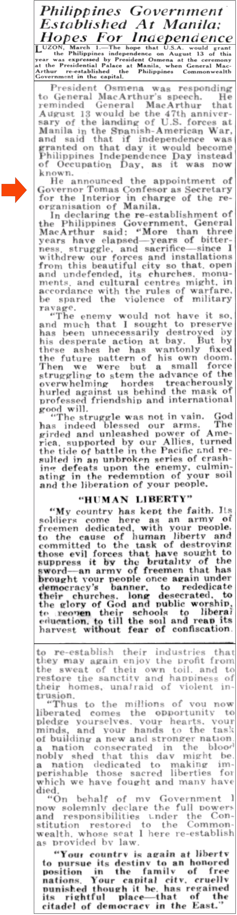 President Osmeña Announced the Appointment of Governor Tomas Confesor