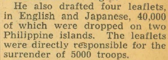 He had drafted four leaflets, in English and Japanese, 40,000 of which were dropped on two Philippine islands (Panay Island and Negros Island).