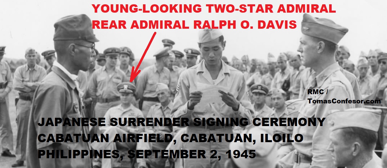 On the other hand, at the surrender signing ceremony at Cabatuan Airfield on September 2 1945, there was somebody there who fitted the bill, a young looking two-star officer, in the person of Rear Admiral Ralph O. Davis, who had arrived only the day before, September 1, 1945, aboard his flagship USS Estes, so Davis could have been only at the surrender signing ceremony at Cabatuan Airfield and not in the Maasin meeting in August.