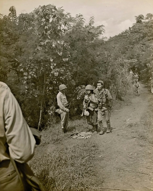 Early in the morning two days later, An American sergeant of Japanese descent arrived at the forward command post in a jeep. We had him escorted by a squad of riflemen led by an officer who was familiar with the area, and we hired four civilians to carry his sound equipment and heavy storage batteries. I went along as observer.