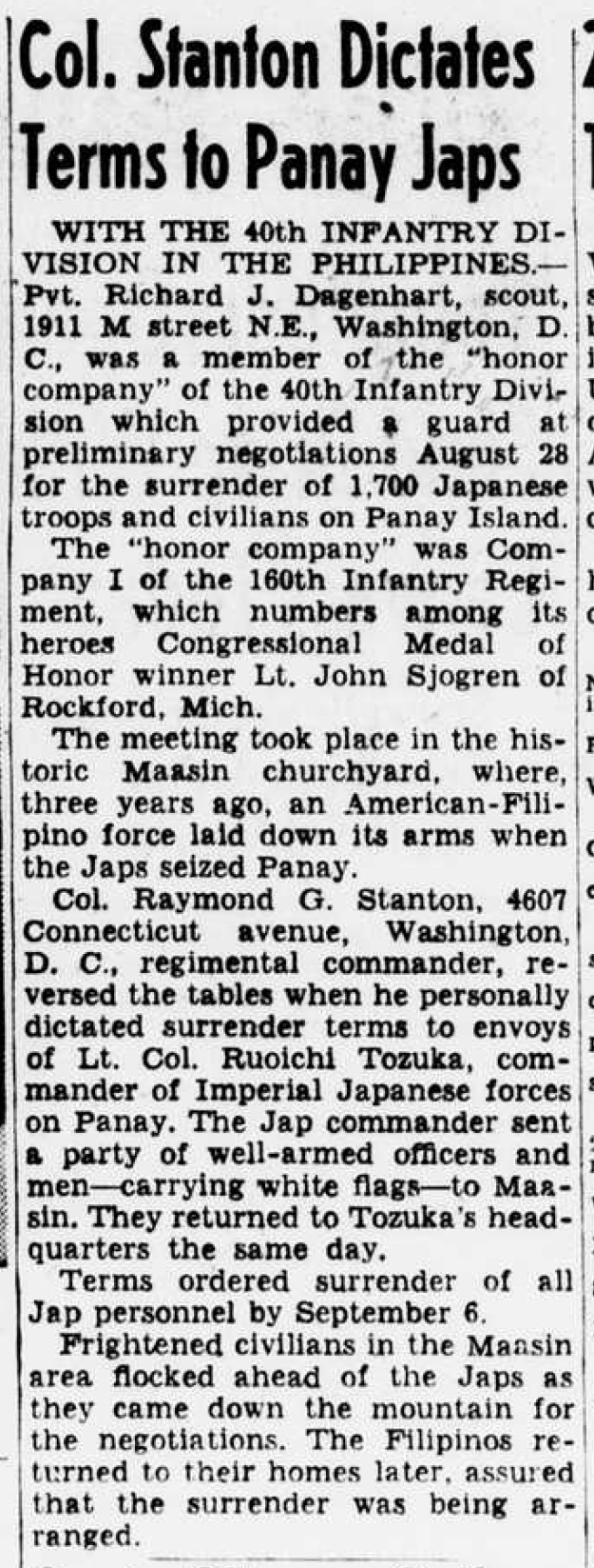 At the surrender signing ceremony at Cabatuan Airfield on September 2, 1945, the instrument of surrender was signed by the overall Japanese commander Lieut. Col. Ryoichi Tozuka for the Japanese, and by the 160th US Infantry Regiment commander Col. Raymond G. Stanton for the Americans and Filipinos. Protocol dictates that a surrender be received by an officer of about the same rank and position, and so Col. Stanton was designated to receive even though his superiors were also present.