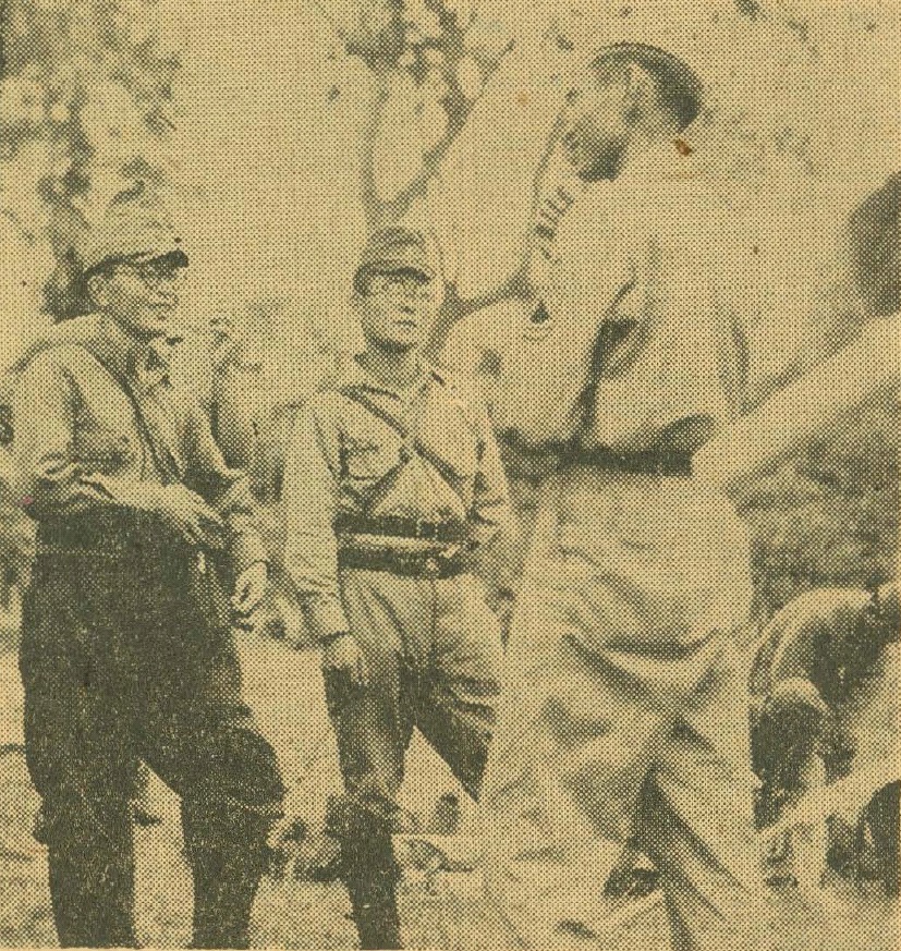 T-Sgt. Terno Odow, rightmost, with Lieut. Sadayoshi Ishikawa and Capt. Kaneyuki Koike, at Daja, Maasin, on August 28, 1945