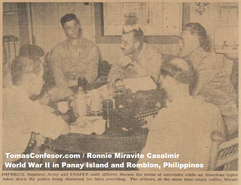 IMPERIAL Japanese Army and USAFFE staff officers discuss the terms of surrender while an American typist takes down the points being discussed for later rewriting. The officers, at the same time, enjoy coffee, biscuit.