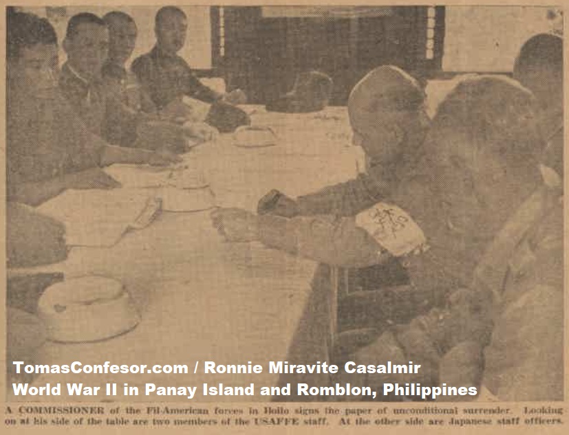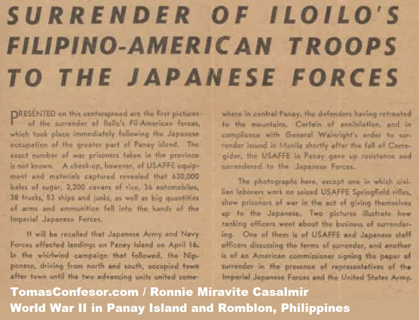 It will be recalled that Japanese Army and Navy Forces effected landings on Panay Island on April 16. In the whirlwind campaign that followed, the Nipponese, driving from north and south, occupied town after town until the two advancing units united somewhere in central Panay, the defenders having retreated to the mountains. Certain of annihilation, and in compliance with General Wainright's order to surrender issued in Manila shortly after the fall of Corregidor, the USAFFE in Panay gave up resistance and surrendered to the Japanese Forces.