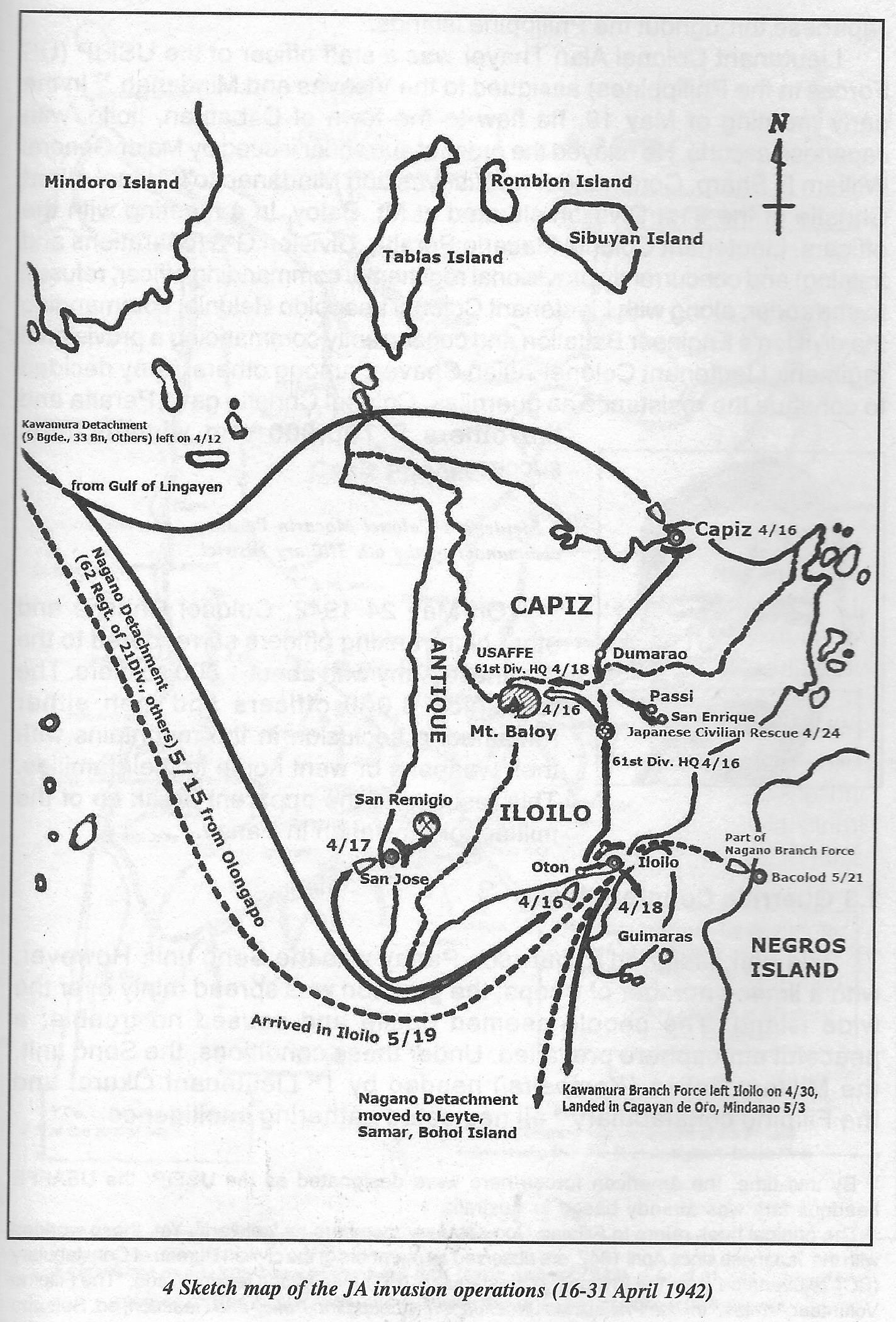 The Japanese invasion forces split into two at Oton. The main strength of the Kawamura Detachment headed north while elements of the Seno unit–the 3rd Company (commanded by 1st Lieutenant Jôdo Takahashi) and 4th Company (commanded by 1st Lieutenant Matao Asahi)–entered Iloilo City later that morning.
