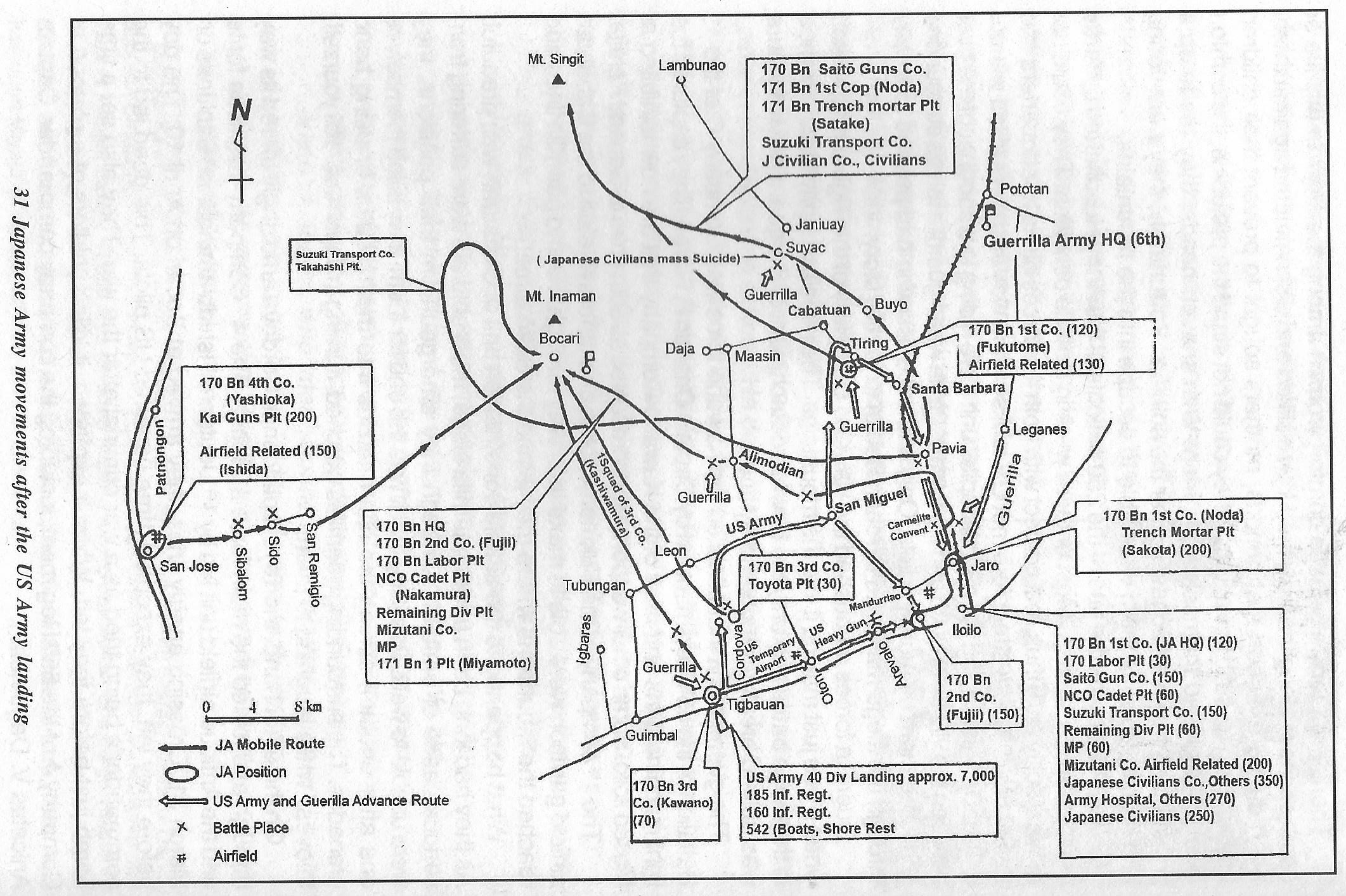 The attack was to commence at 8 p.m. that night, since we would have to force our way through enemy lines before the moon rose at 10 p.m. Before reaching Pavia, we should make a quick turn towards the direction of San Miguel. Behind the first line, the 60 men of the headquarters unit, 60 men of the Kempeitai, 180 of the Mizutani Force, 50 of the remaining 102nd Division Nakamura unit, 200 Hôjin, 80 of the Hôjin Company, the Army Hospital Force and 300 patients, were to follow. Then, the 20 trucks and 20 horses, guarded at the rear by 150 members of the Fujii Company. It was emphasized to all that everyone should arrive at Alimodian by dawn of the next day.