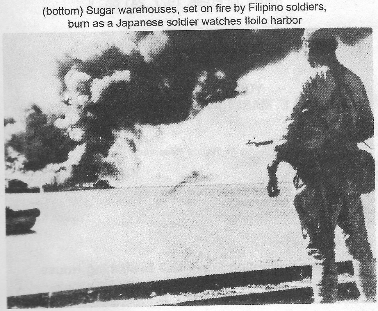 Sugar warehouses, set on fire by Filipino soldiers, burn as a Japanese soldier watches Iloilo Harbor.