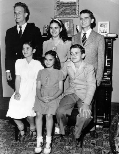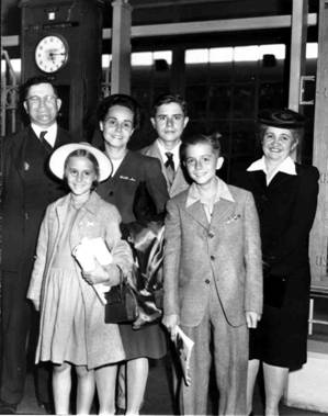 Back row: Thomas J. Ford, Sr., Consuelo B. Ford, Henry A. Ford, Mrs. Thomas J. Ford. Front row: Consuelo and Stanley Ford. Consuelo B. Ford and her three children arrived in her husband’s home town after being liberated from Santo Tomas Internment Camp, Manila, Philippine Islands. Mr. and Mrs. Thomas J. Ford, Sr., and four of their seven children were rescued by a U.S. submarine from the island of Panay, Philippine Islands, after hiding in the mountains for two years.